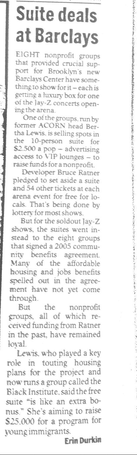 Erin Durkin of the Daily News got the story first, reporting (in an article not online) yesterday that each of the Community Benefits Agreement signatories got access to a Barclays Center suite for each of the Jay-Z concerts.