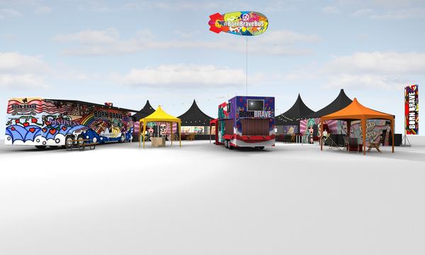 Lady Gaga brings her Born Brave Bus tour to the Barclays Center on March 6, complete with a "modertn tailgate for youth," offering mental health counseling. One rendering (right) suggests a potential set-up, using a parking lot.