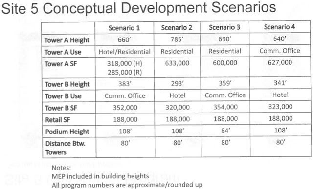 Site 5 was said to have 323,598 square feet of development rights overall, given a 1.24 acre parcel (53,933 square feet) and a buildable Floor Area Ratio (FAR) of 6, meaning a multiple of a fully built-out parcel.