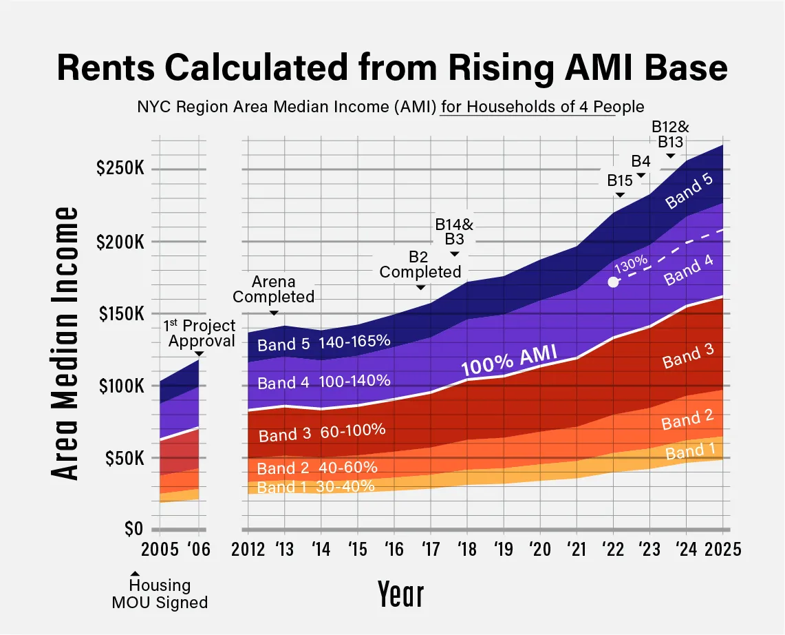 Instead of paying $100 million in one transaction for railyard development rights, as agreed by Forest City in 2005, the developer and the MTA renegotiated the deal (terms) in 2009.