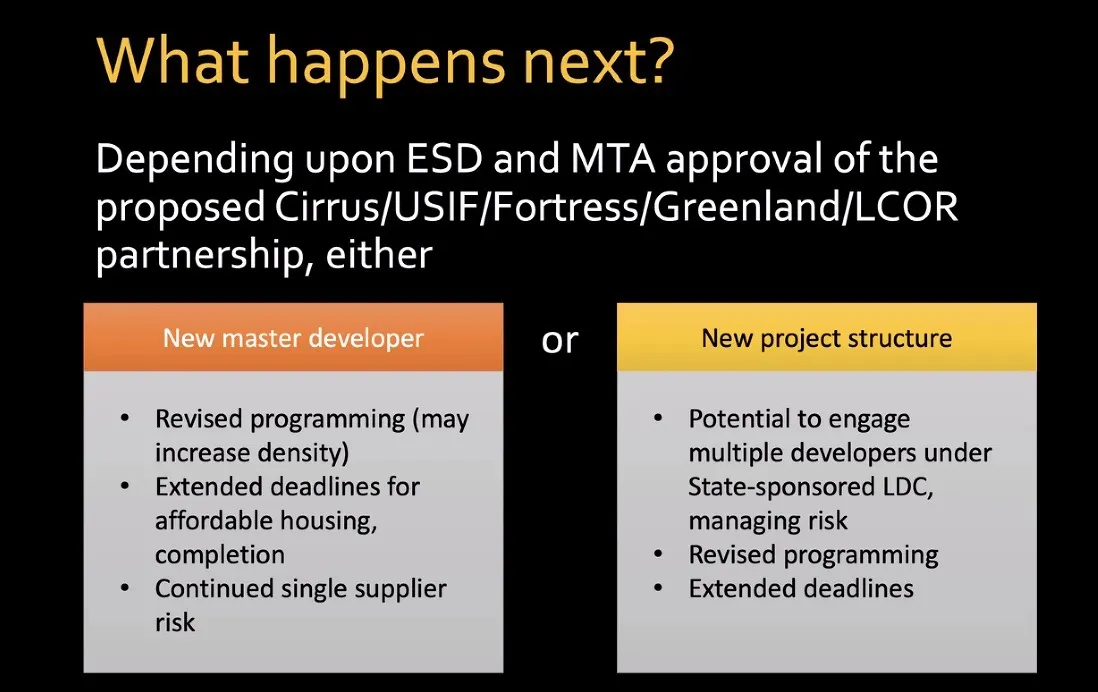 That new joint venture apparently involves Cirrus Real Estate Partners, Fortress Investment Group, an affiliate of the U.S. Immigration Fund (USIF), the firm LCOR, and existing developer Greenland USA, surely will seek to revise obligations and gain concessions, while likely making new promises of deferred public benefits.